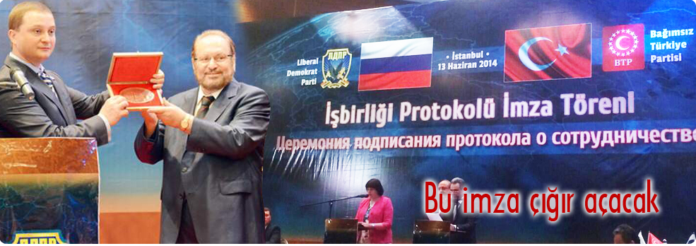 Bağımsız Türkiye Partisi (BTP) Genel Başkanı Prof. Dr. Haydar Baş ile Rusya Liberal Demokrat Parti (LDP) Dış İlişkilerden Sorumlu Genel Başkan Yardımcısı Milletvekili Roman İvanoviç Hudyakov, Rusya ile Türkiye arasında arasındaki sınırları ve setleri tümüyle ortadan kaldıran tarihi önemdeki Mutabakat Zaptı’nı dün İstanbul’da imzaladı. Sheraton Ataköy Otel’de yapılan imza merasimine BTP ve LDP kurmaylarının yanı sıra Rusya’nın İstanbul Başkonsolosu Aleksey Yerhov da katıldı. Baştan sona görkemli geçen Mutabakat Zaptı İmza Töreni’nde konuşan BTP Genel Başkanı Prof. Dr. Haydar Baş, sözlerine Mustafa Kemal Atatürk’ün ‘Yurtta Sulh, Cihanda Sulh’ sözüyle başladı ve şöyle devam etti: “Esasen Atatürk’ün bu veciz ifadesi Peygamber Efendimizin buyurmuş olduğu ‘Müslüman öyle bir kişidir ki, bütün insanlar elinden ve dilinden fayda görür’ eksenindedir.”